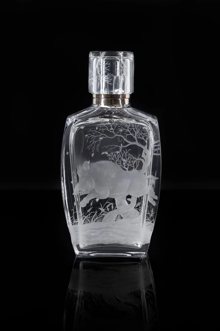 Оригинал не сохранился, сервиз полностью воссоздан по чертежам и рисункам. На каждом предмете изображены сцены охоты, рисунок нигде не повторяется. В современном исполнении темы гравировки и декор пробок могут варьироваться.