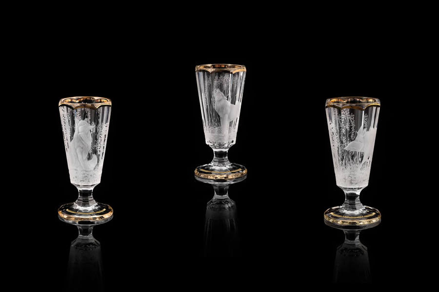 Хрусталь, ручная матовая гравировка, роспись платиной или золотом.